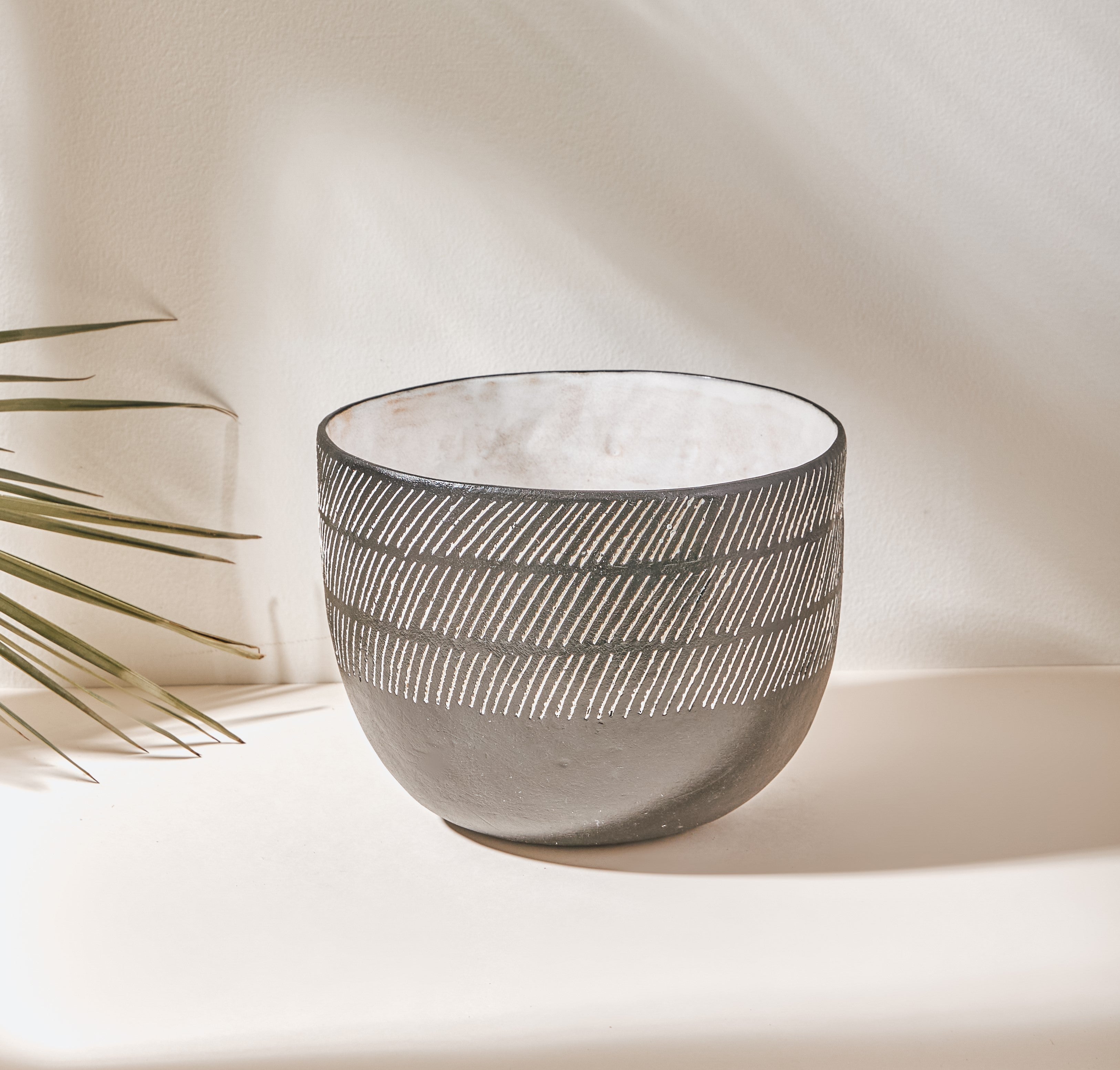 The clay's texture, along with hand-painted lines, edges and circles, embody artistic expressions inspired by primitive cultures.